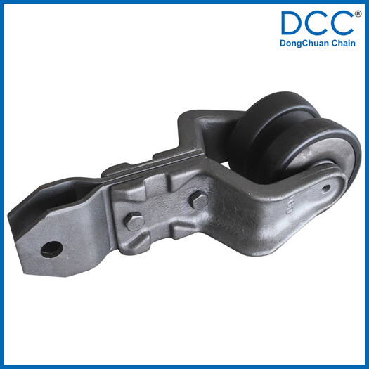 滑架的作用是承受物件,吊具及鏈條的重量,仔垂直彎曲段還要承受鏈條張緊的合力,并能保證鏈條按軸道的線路運行。在線路中兩個負載滑架之間距離超過800-900mm時,可在中間增加一個空載滑架。滑架系列主要包括X348型, X458型, X678型, CC100型, X160型 。