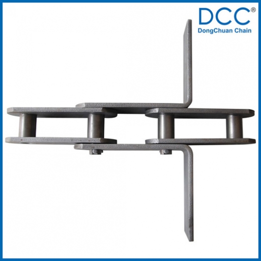 | Pitch P (mm) | Inner width of inner link b1 (mm) | Diameter of pin d2 (mm) | Diameter of roller d1 (mm) | Height of sidebar h2 (mm) | Thickness of sidebar T (mm) | Pitch of attachment L (mm) | Central distance of attachment L1 (mm) | Hole diameter of attachment d4 (mm) | Height of attached side plate h4 (mm) | Tensile strength (KN) |