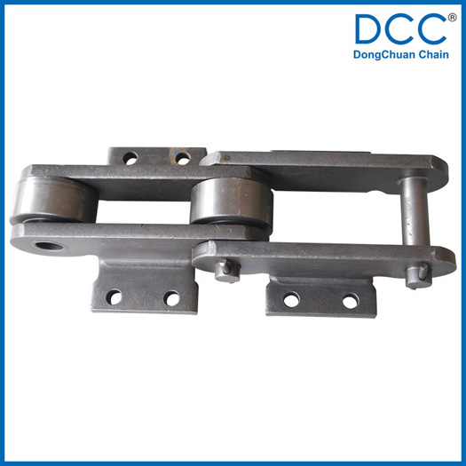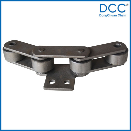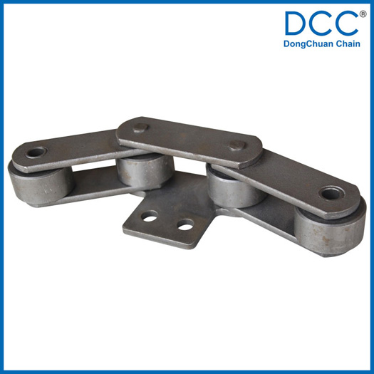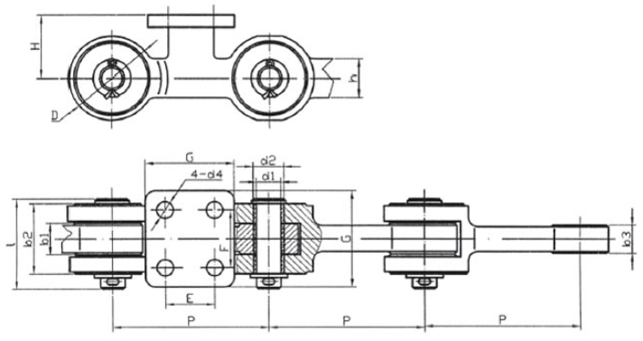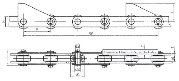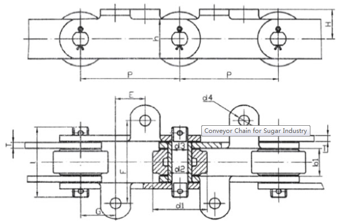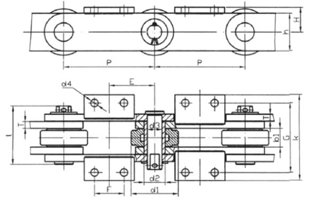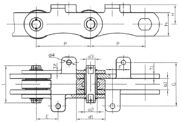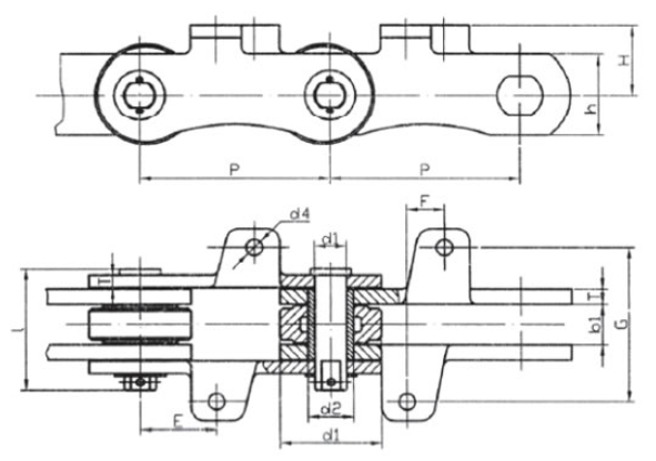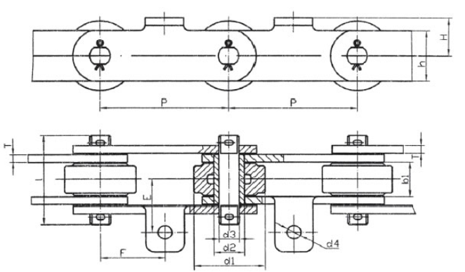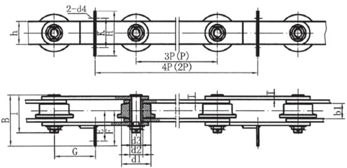 Chain no.Pitch P (mm)Inner width of inner link b1 (min.) (mm)Diameter of pin d3 (mm)Diameter of roller d1 (min.) (mm)Height of sidebar h (mm)Thickness of sidebar T (mm)Length of pin L (mm)Central distance of attached plate f(mm)Hole distance of attached plate L1(mm)Hole diameter of attached plate d4(mm)Spanning width of attached plate L2(mm)Height of attached plate h4(mm)Tensile strength (KN)